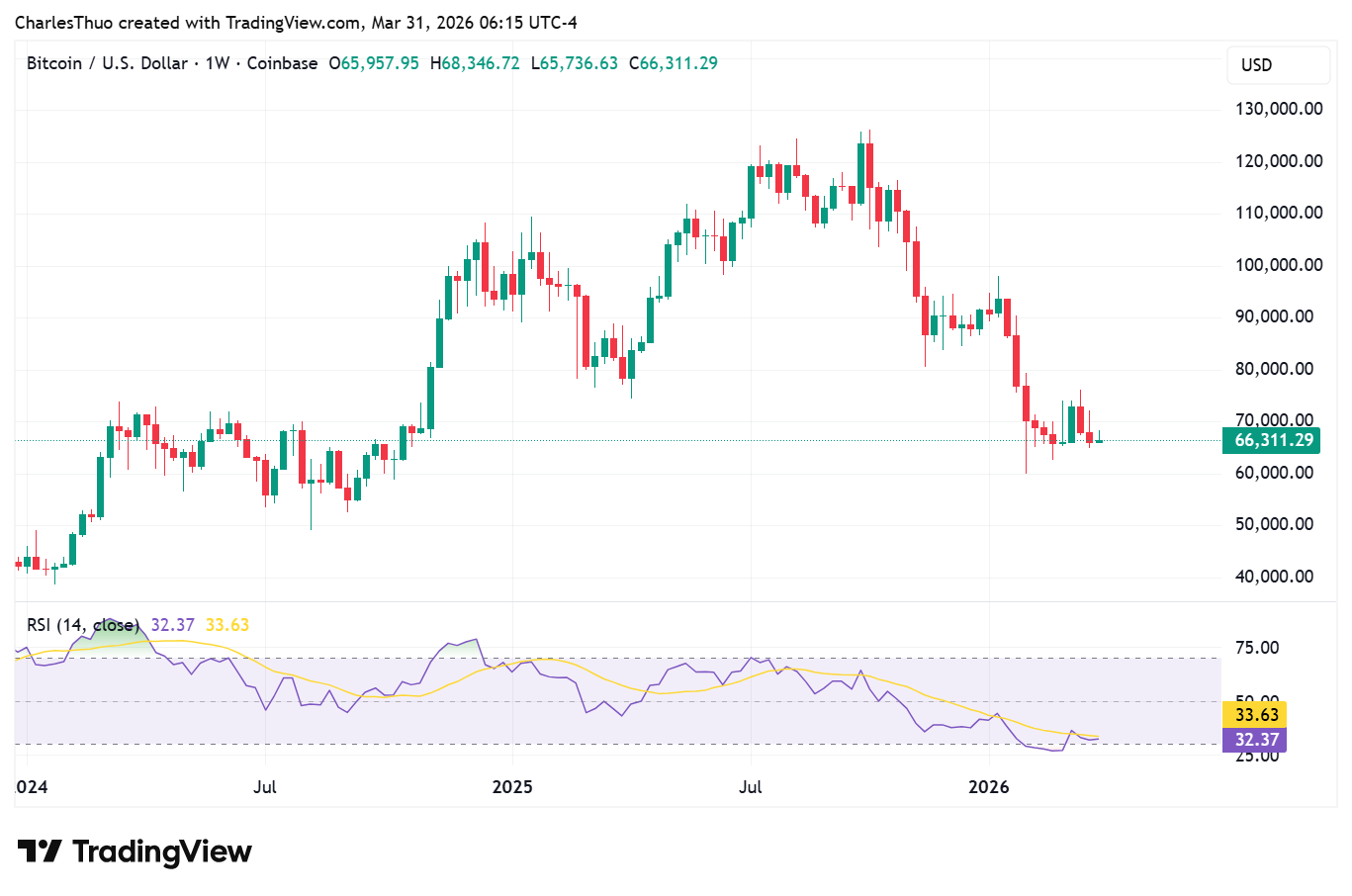 This level often indicates a potential bounce, but the market has yet to show sustained buying strength. Short-term momentum is fragile, with price action struggling to maintain levels above $66,000.