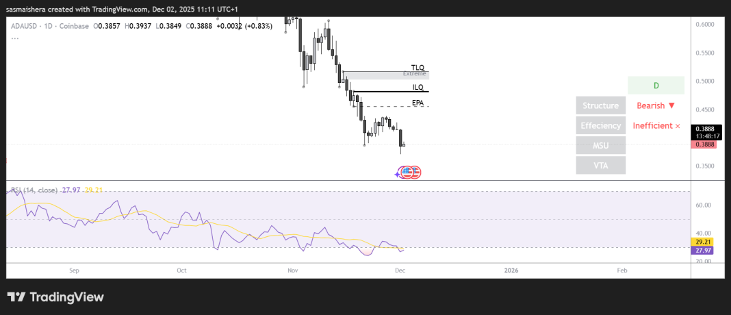 The ADA/USD daily chart is bearish and inefficient as Cardano has underperformed in recent weeks. The coin dropped below $0.40 after losing 35% of its value in November and could dip lower over the coming days and weeks.Â