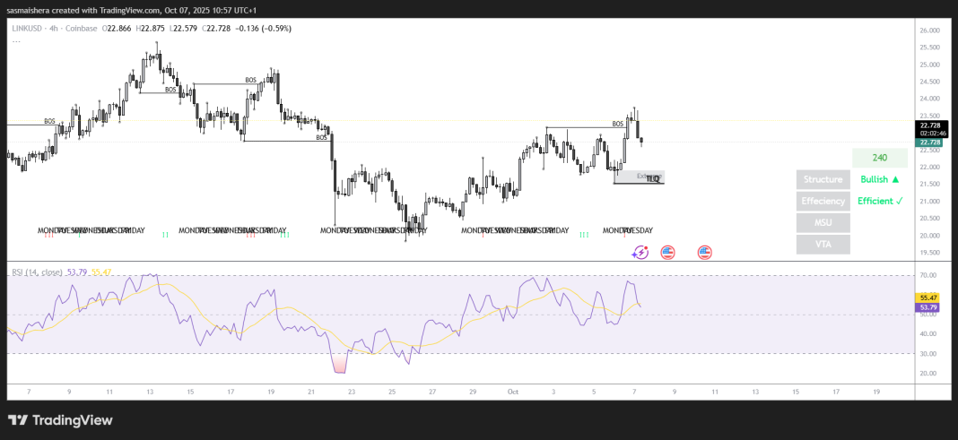 - LINK is up 2% in the last 24 hours and is now trading above $22.