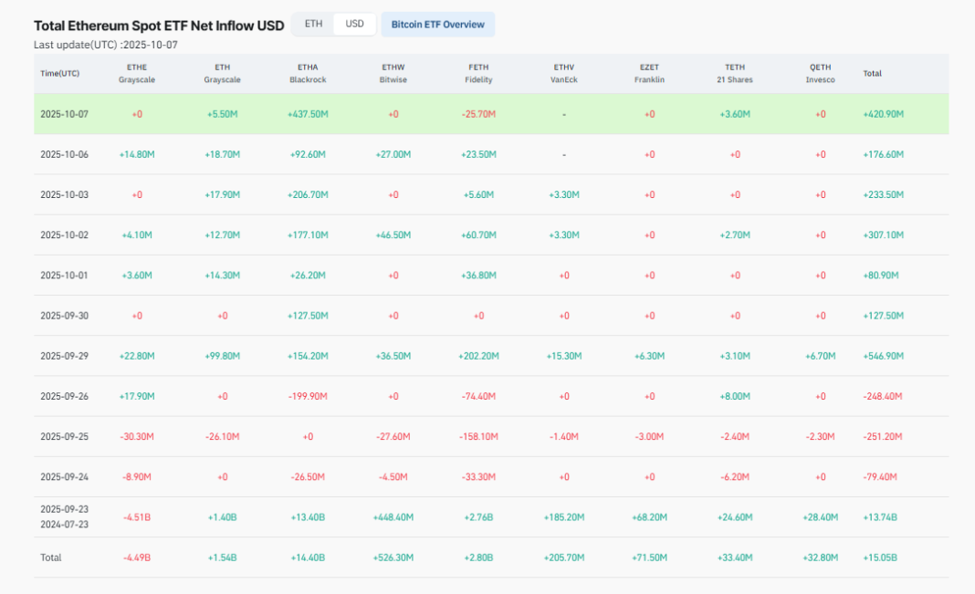 US spot Ethereum ETFs have continued to attract significant attention, recording $420.90 million in inflows on October 7, marking the seventh consecutive day of positive flows.