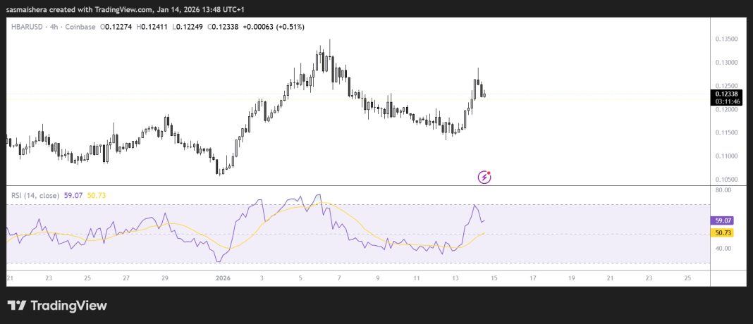The HBAR/USD 4-hour chart is currently bullish after Hedera extended its value above $0.12 earlier this year. At press time, HBAR is nearing the 50-day Exponential Moving Average (EMA) at $0.127.