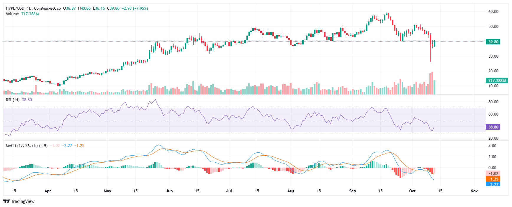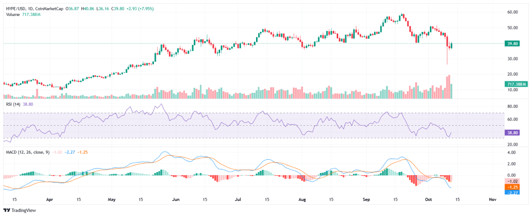 Momentum indicators look mixed: RSI sits close to oversold territory at about 38.8, suggesting room to run, while MACD readings remain bearish.