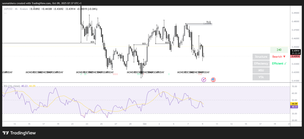 At press time, JUP is trading at $0.4367. If the coin recovers from its slump, it could surge higher towards the TLQ and resistance level at $0.477. An extended rally would allow the coin to top the $0.50 mark for the first time since September 22.