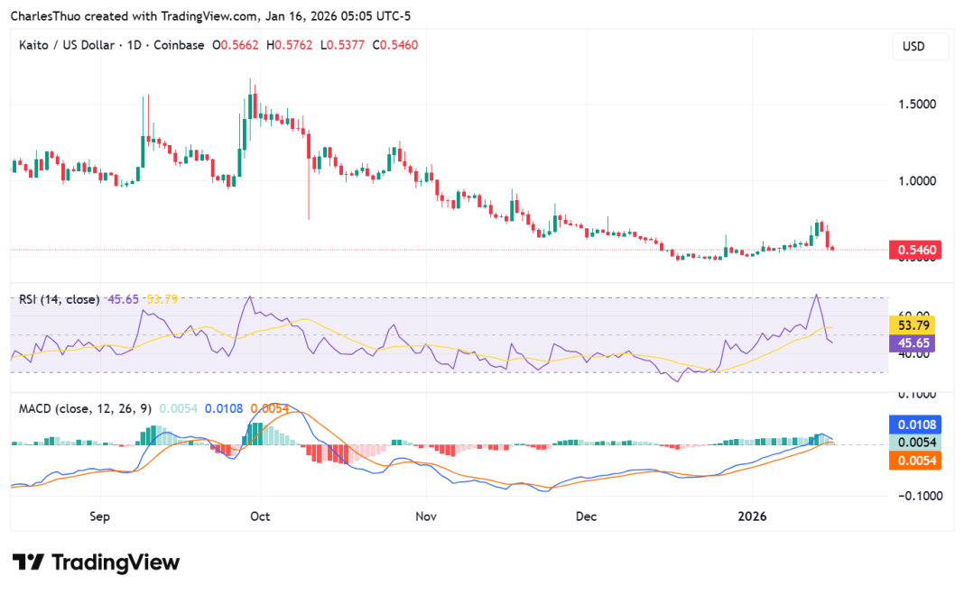 In the short term, price action remains fragile as long as KAITO trades below the $0.60 resistance zone.