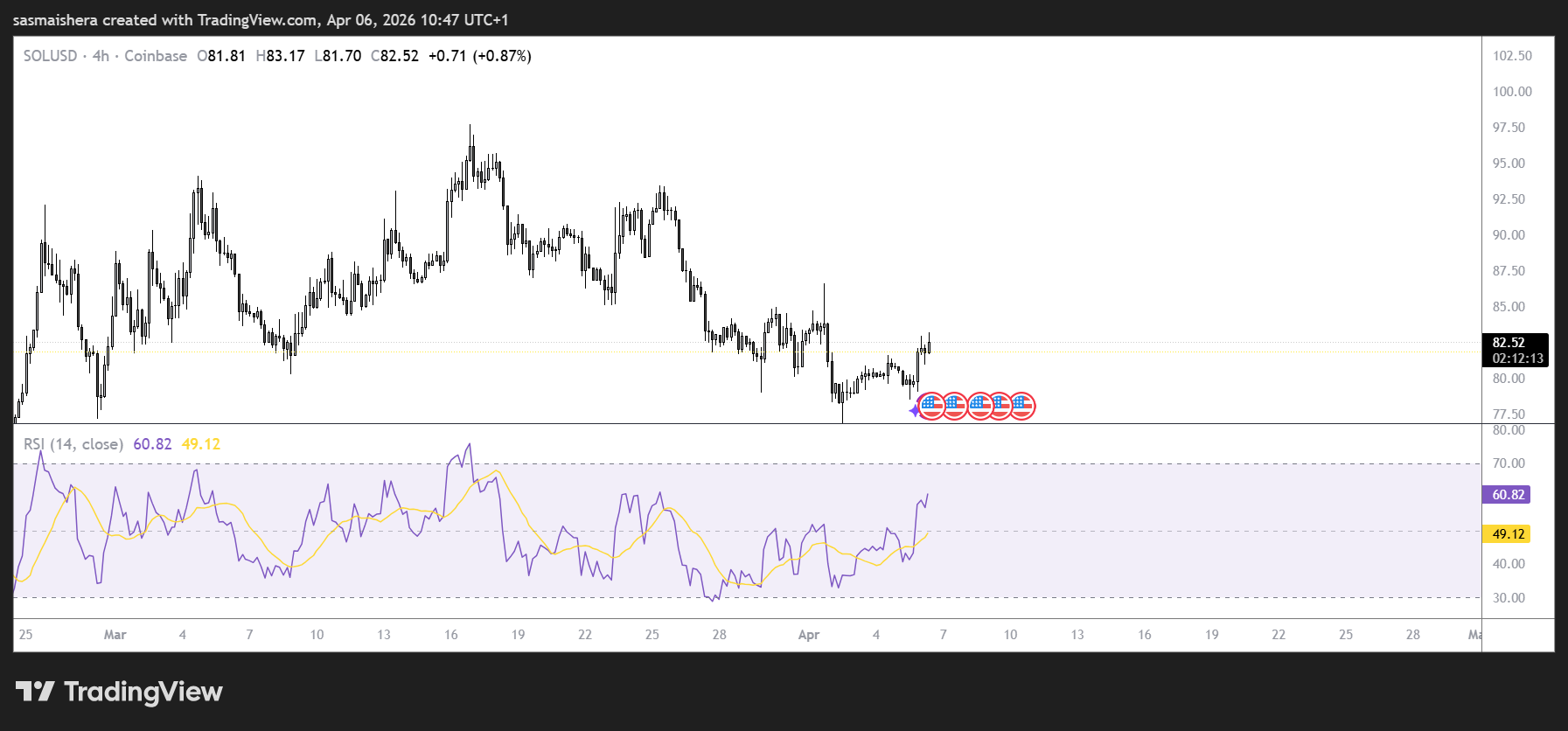 The SOL/USD 4-hour chart is bullish and inefficient, with the coin up by nearly 4% in the last 24 hours. At press time, SOL is trading at $82.50 per coin.Â