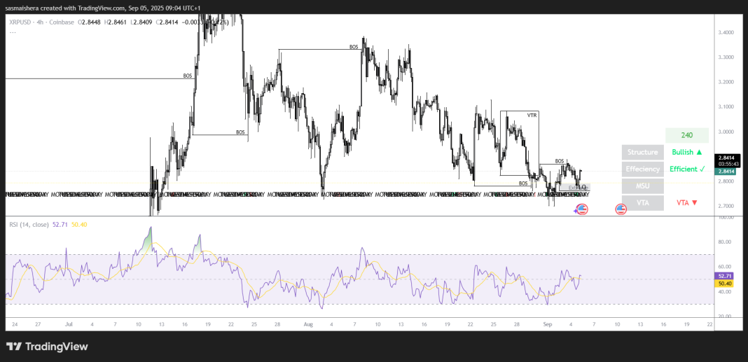 The XRP/USD 4-hour chart remains bullish and efficient as XRP recovers from its recent dip. XRP found support around its daily level at $2.70 earlier this week. However, it faced a rejection on Wednesday and declined on Thursday, firmly retesting the 100-day EMA at $2.77.
